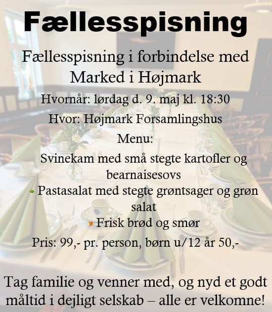 Kommende arrangementer I Højmark Forsamlingshus laver vi forskellige arrangementer. Husk at sætte kryds i kalenderen og at booke bord i god tid – Se kommende arrangementer herunder: