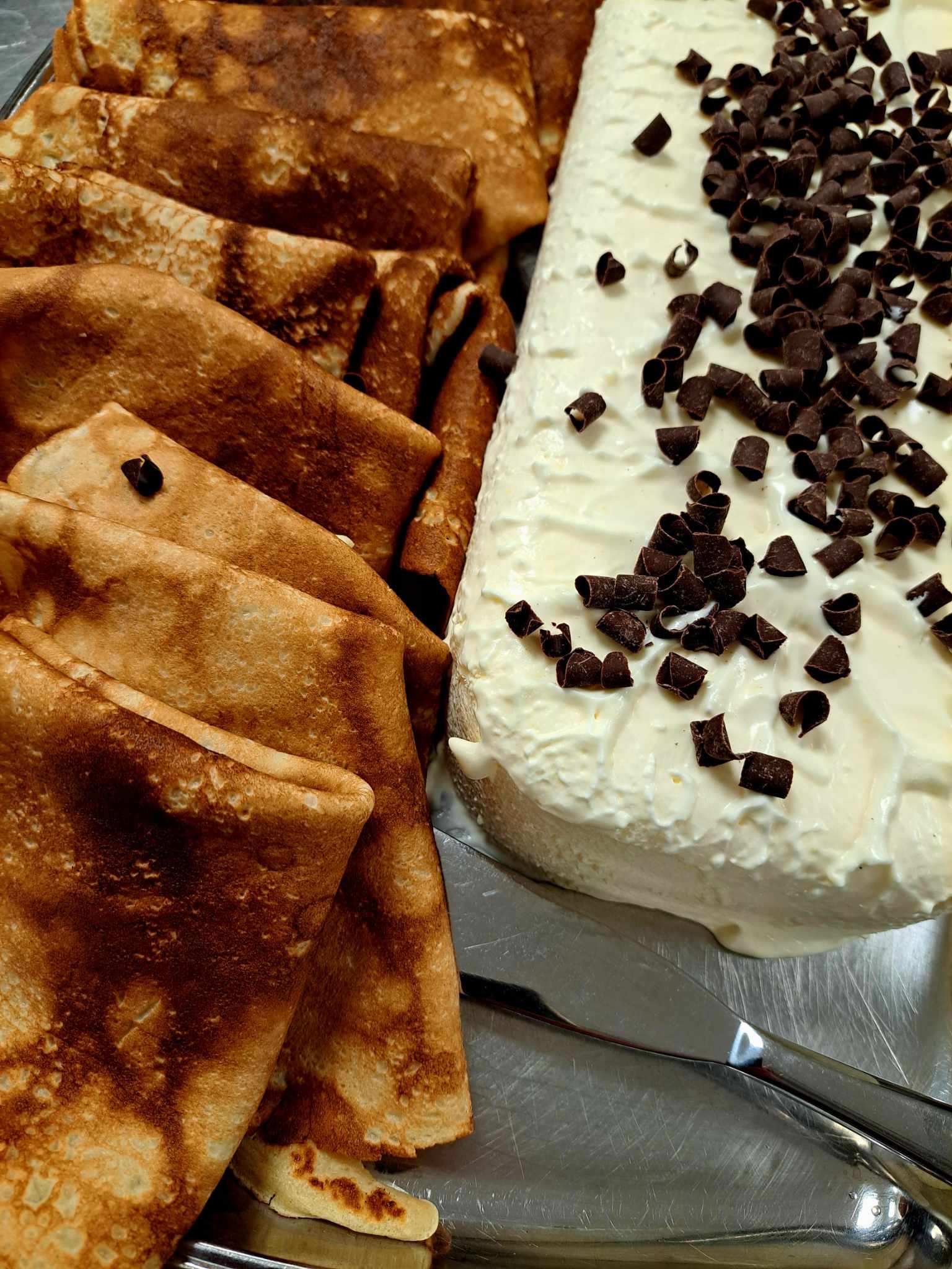 Lækre pandekager og cremede flødevaniljeis. Serveringen indeholder 20 pandekager og flødeis nok til 10 personer – en ideel løsning til hyggelige aftener, fødselsdage eller festlige sammenkomster.